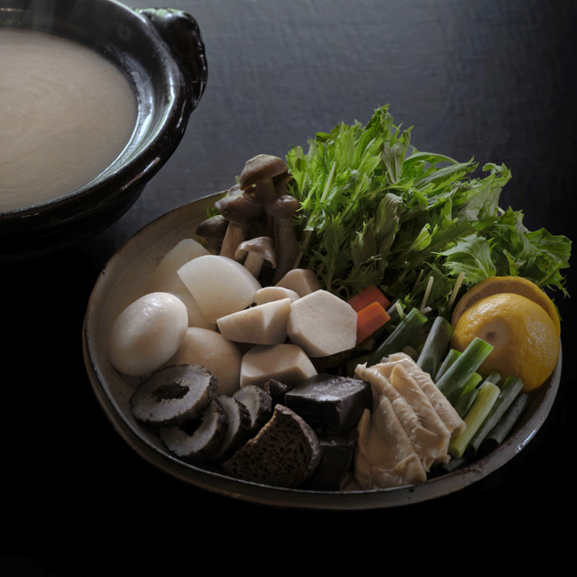 京水菜、九条葱、胡麻豆腐、金時人参、海老芋、生湯葉、揚げ麩、堀川牛蒡、生麩、聖護院大根、畑しめじ、小餅、蓮根麺、和がらし、柚子、白味噌だし