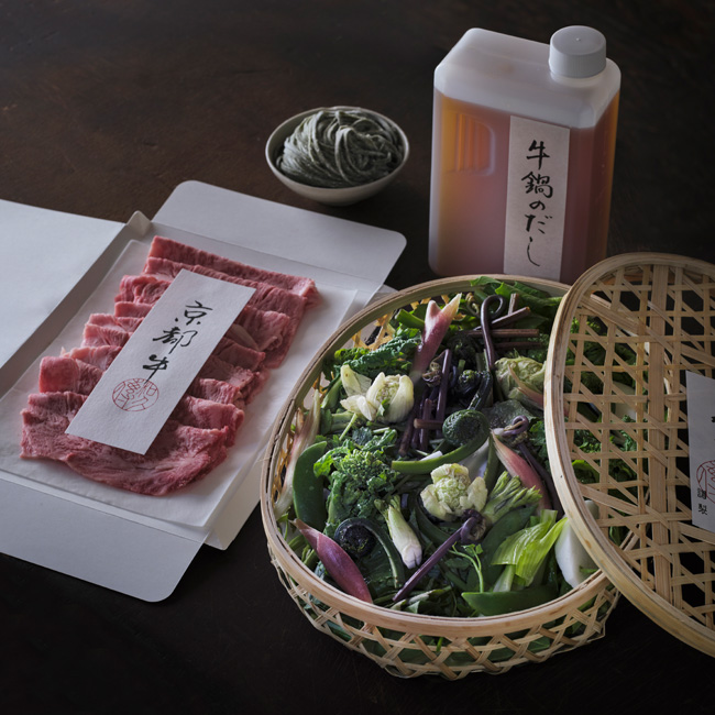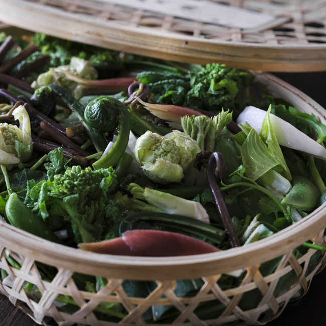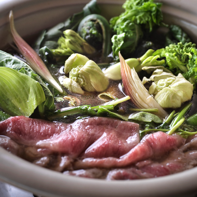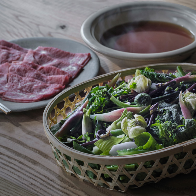 2人前:菜の花、うるい、こごみ、たらの芽、蕗のとう、蕨、茗荷、スナップエンドウ、芹、春菊、青梗菜、蕪、牛サーロイン、桑麺、特製だし