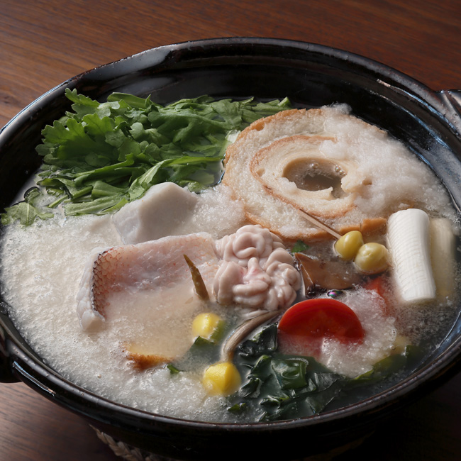 - 2人前:甘鯛、雲子、海老芋、金時人参、堀川牛蒡、冬菇椎茸、菊菜、若布、白葱、蓬餅、湯葉、車麩、南瓜麩、姫くわい、銀杏、丸大根、近江蕪、長芋、柚子、特製だし