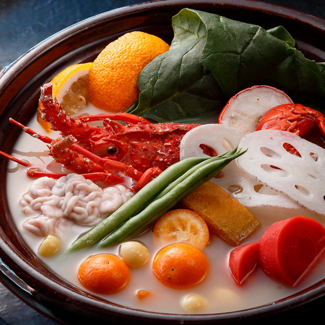 2人目:伊勢海老、雲子、柚子、冬菇椎茸、法蓮草、聖護院大根、金時人参、南瓜、金柑、いんげん、銀杏、蓮根、蓬餅、白味噌だし