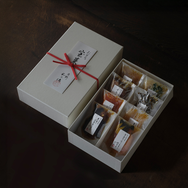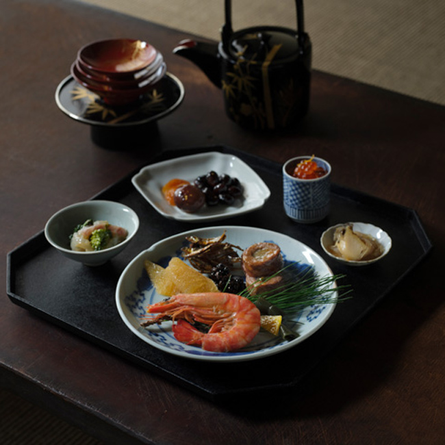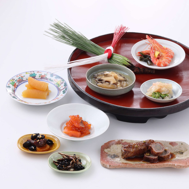 - 黒豆と渋皮栗の甘煮(140g)、車海老と結び昆布の柚香煮(150g)、牛肉八幡巻き(140g)、数の子の味醂粕漬け(55g)、いくらとスモークサーモンの醤油漬け(100g)、田作りと黒豆(40g)、鮑とふかひれの旨煮(100g)、鯛と菜種のこのわた糀和え(90g)