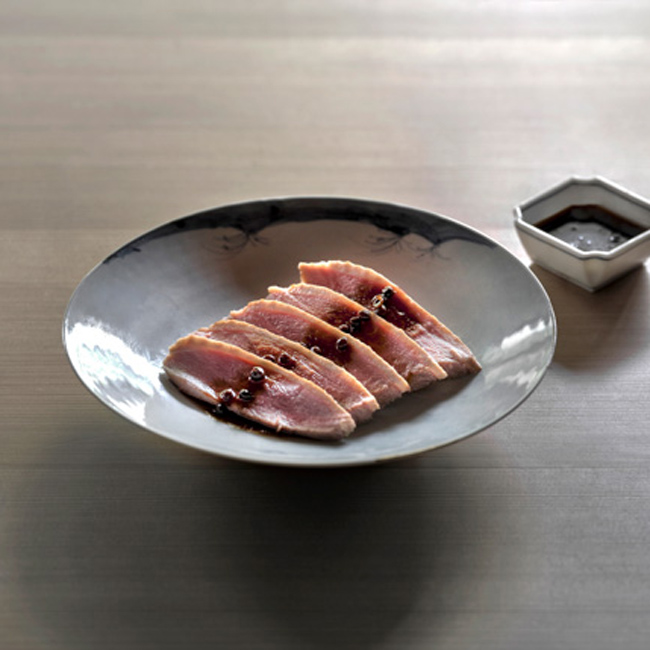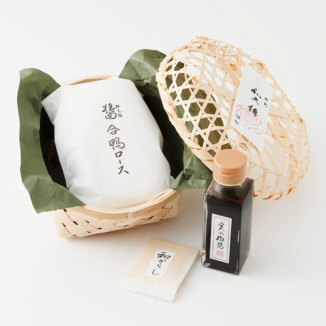 合鴨ロース230g、実山椒醤1本、和がらし ※合鴨肉はブロック状ですので、お好みの厚さに切り分けてお楽しみください。